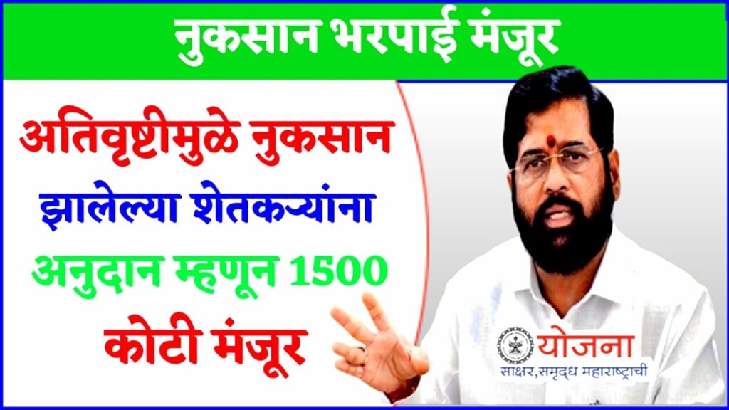 नुकसान भरपाई GR शेतकरी मित्रांनो, 13 जून 2023 रोजी झालेल्या मंत्रिमंडळ बैठकीत गेल्या वर्षी संततधार पावसामुळे नुकसान झालेल्या शेतकऱ्यांना 1500 कोटी रुपयांची मदत देण्याचा निर्णय घेण्यात आला. MahaDBT Farmer Scheme लॉटरी लागली रे..! महाडीबीटी फार्मर स्कीममध्ये पात्र शेतकऱ्यांना लागली लॉटरी, त्वरित तपासा तुम्हाला लागली का? या बैठकीच्या अध्यक्षस्थानी मुख्यमंत्री एकनाथ शिंदे होते. माहितीनुसार, सुमारे 15.96 … Continue reading nuksan bharpai : अतिवृष्टीमुळे नुकसान झालेल्या शेतकऱ्यांना अनुदान म्हणून 1500 कोटी मंजूर, सरकारचा निर्णय त्वरित पहा